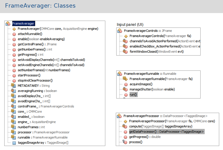 The FrameAverager class instantiates the runnable and the DataProcessor, manages enabling and disabling, and maintains a shared array of TaggedImages.