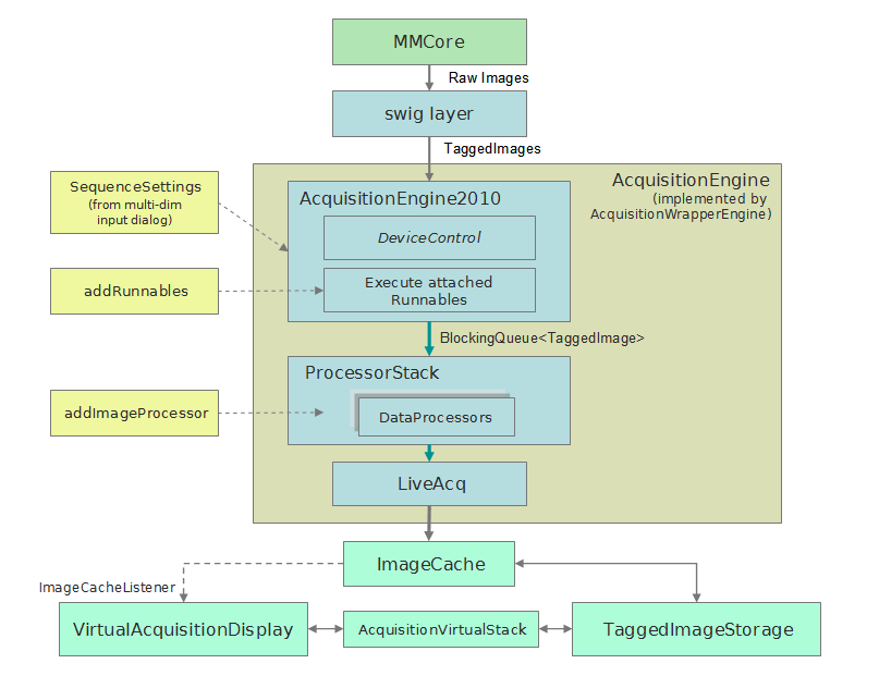 A DataProcessor<TaggedImage> can be added to the image processing chain using AcquisitionEngine.addImageProcessor(). The inputs and outputs of the DataProcessors are connected together in the ProcessorStack. The output of the ProcessorStack is input to the LiveAcq which put the image into the ImageCache where its is saved. The display is notified and updated to show the last image.